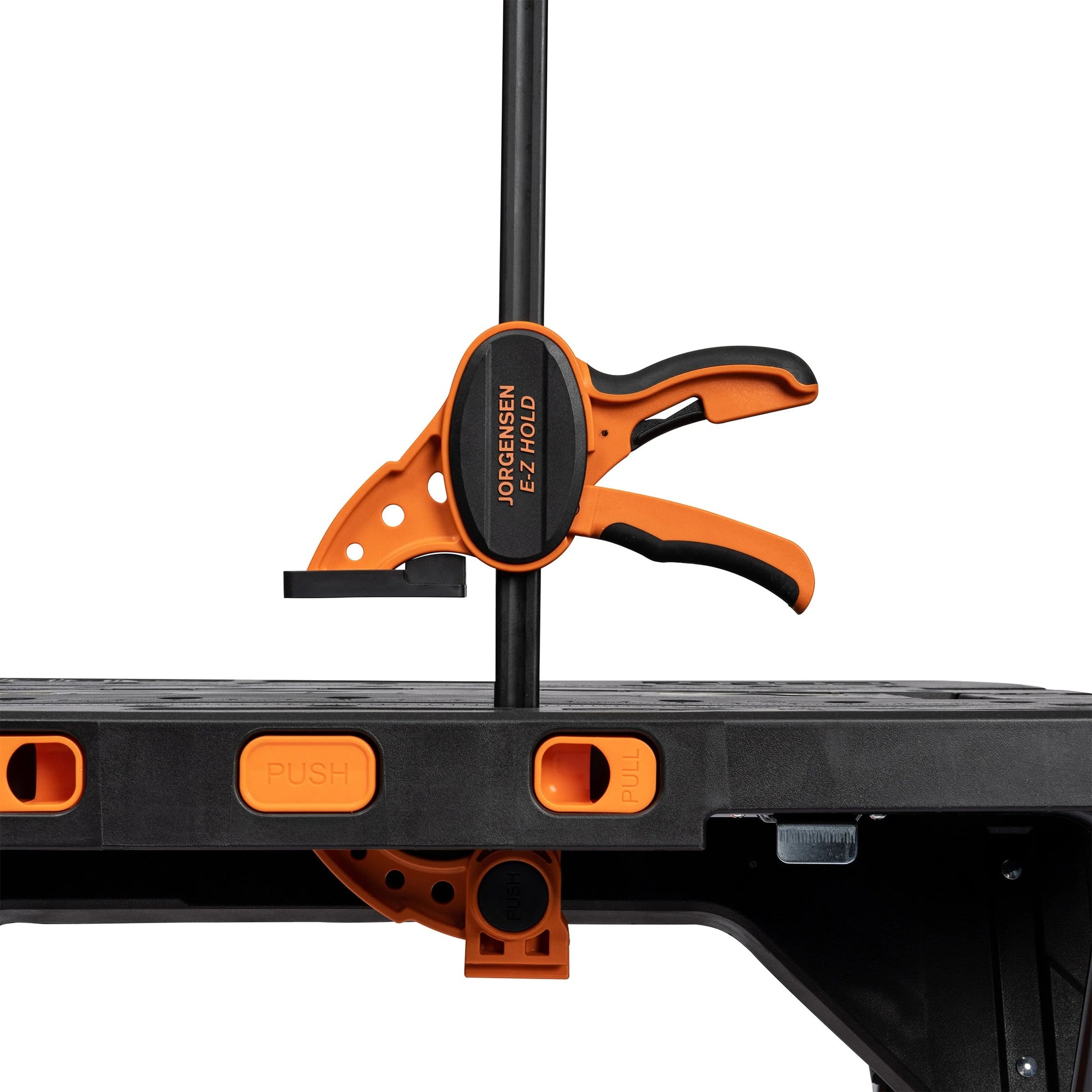 - Quick clamps and holding pegs, supporting up to 500 lb as a table/workbench and up to 1000lbs as a sawhorse.