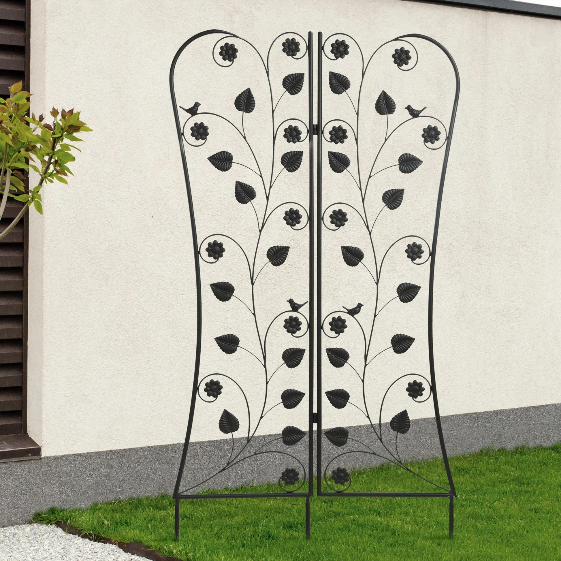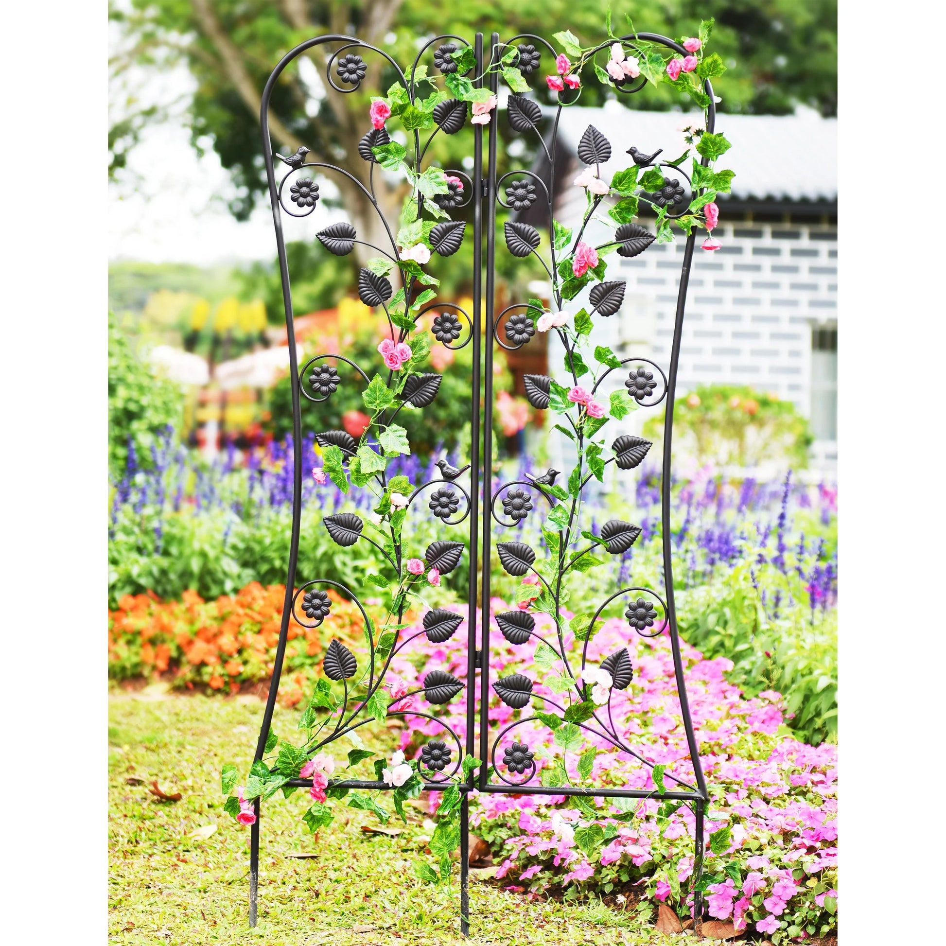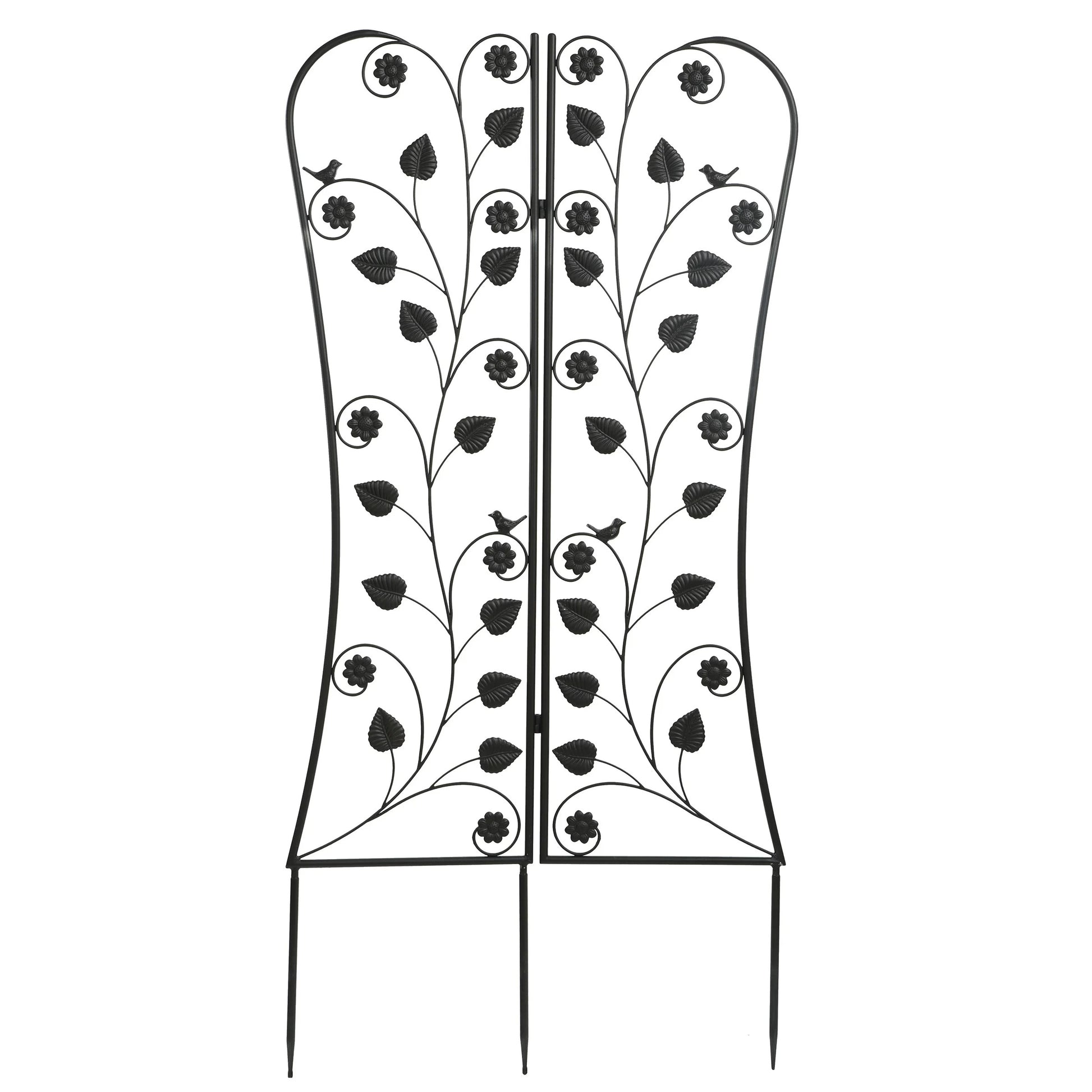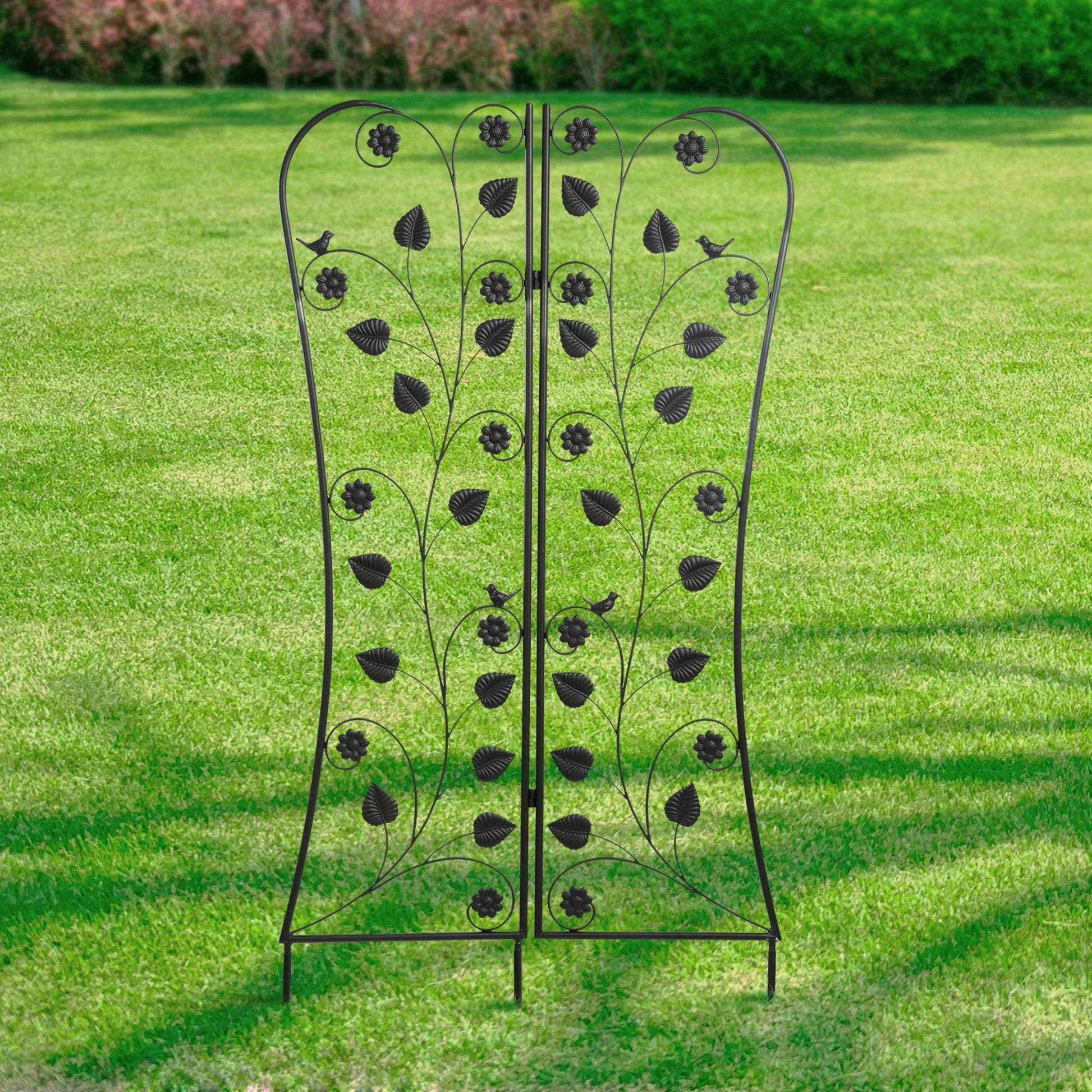 The perfect way to dress up an outdoor area or create privacy with the addition of climbing plants and flowers, this foldable trellis will answer the call. With the flexibility of being able to fold, it can wrap into a corner or around bushes or trees. All steel construction and adorned with birds and flowers, it’s beautiful with or without foliage.