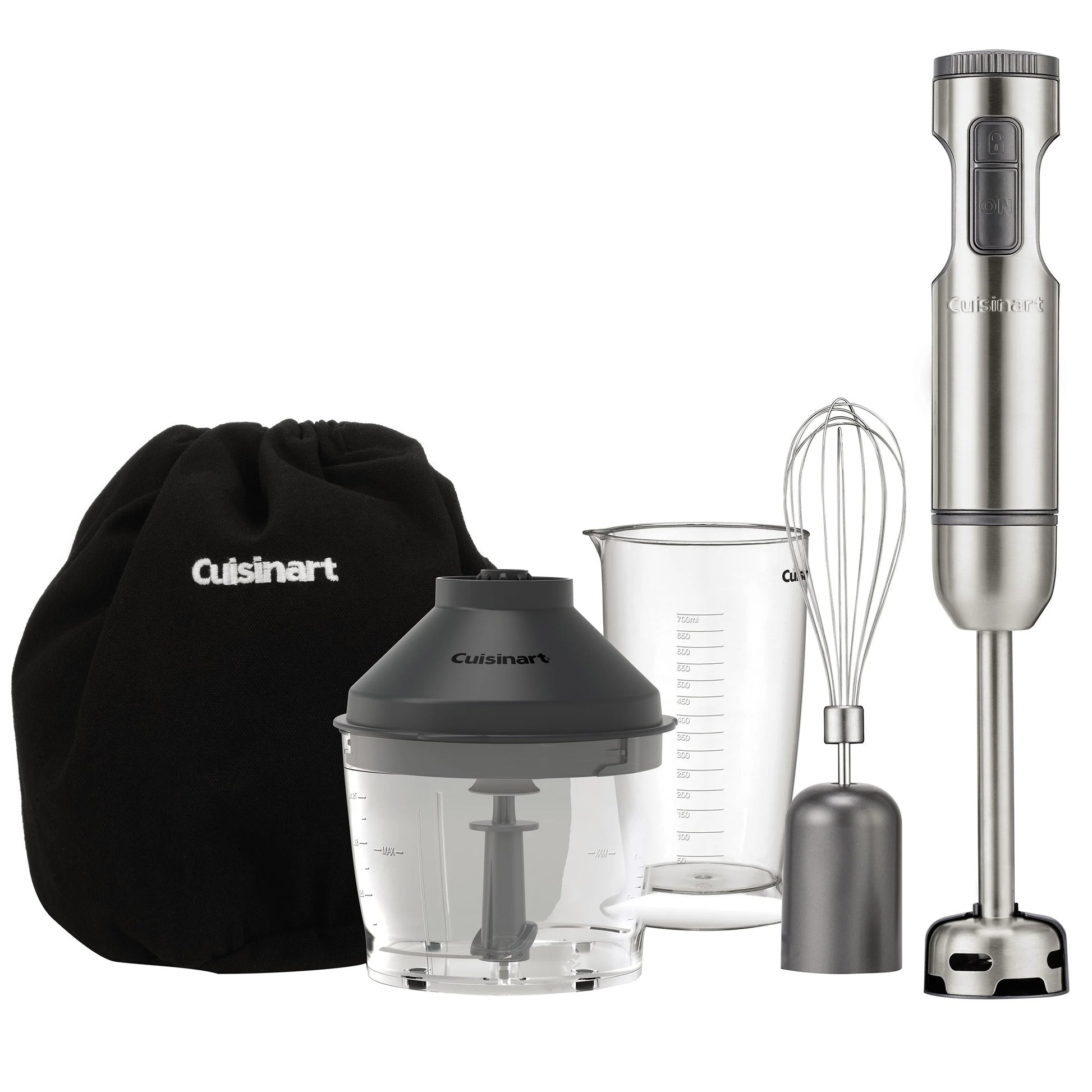 Versatile and durable, this essential kitchen tool provides the high performance today’s home chef’s demand. The 300-watt motor delivers maximum power with minimum noise. The extra-long stainless steel shaft reaches deep to blend in bowls, pots, and pitchers. The mixing/measuring beaker, chopper attachment and full-size chef’s whisk make short work of a wide variety of food prep tasks. From pureeing soup to emulsifying mayonnaise to whipping meringues, this hand blender consistently delivers chef-caliber results.