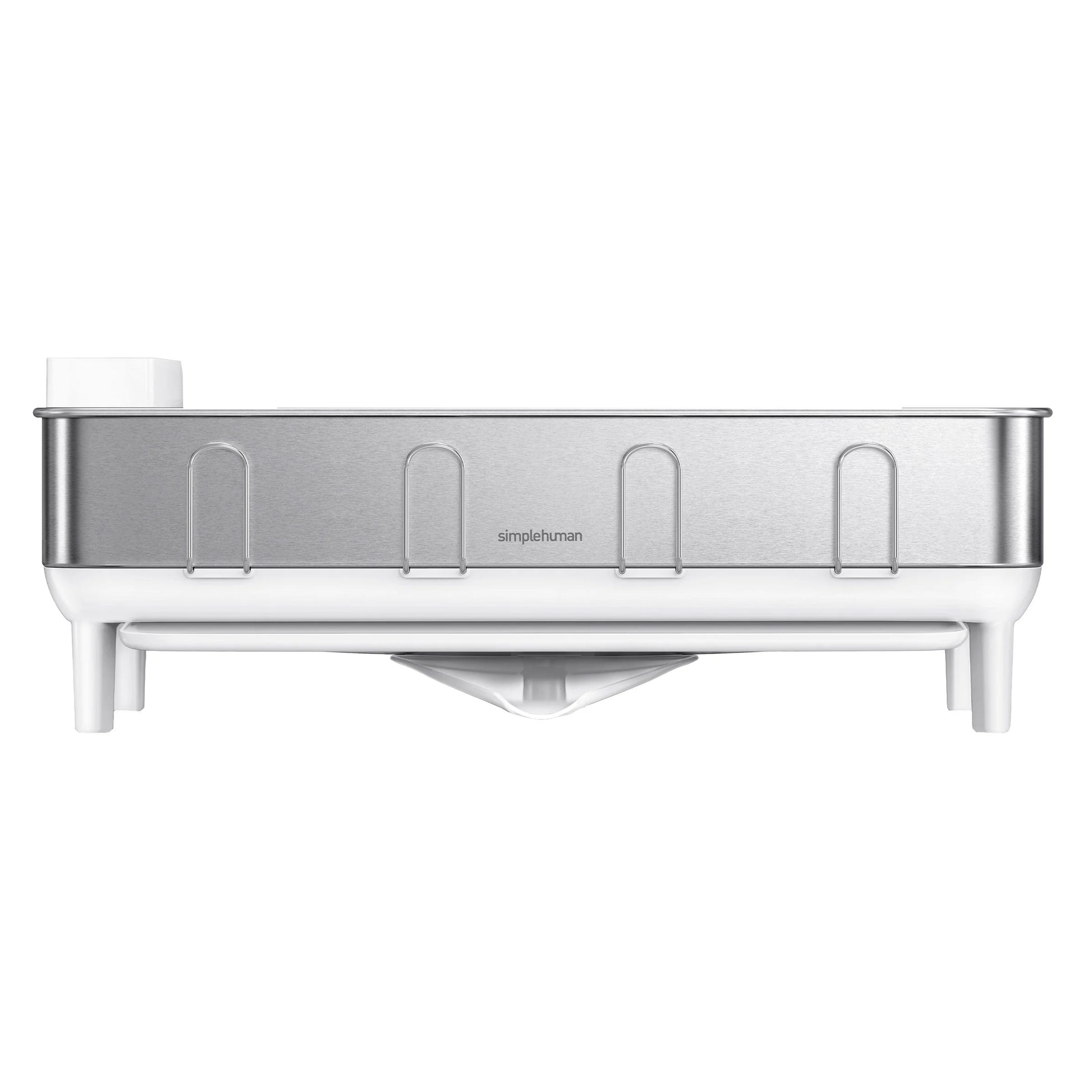 The simplehuman Stainless Steel Frame Dish Rack will match the aesthetic of modern upscale kitchen appliances. The swivel spout rotates 360 degrees in any direction so it drains water directly into the sink — no matter which side you place the dishrack on your countertop — and can be removed for easy cleaning. An anti-residue coating prevents buildup and water spots. A silicone-capped wire rack holds dishes tightly without scratching or chipping. The lower profile with anti-slip rubber feet gives the dishrack greater stability and keeps it firmly in place.